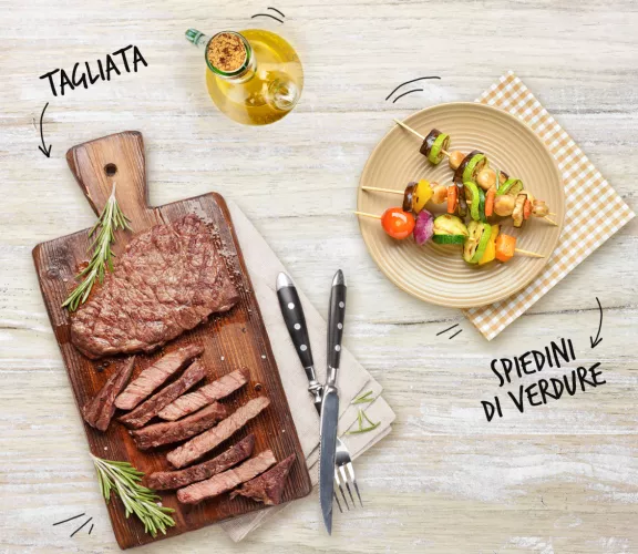 Abbiamo la soluzione che fa al caso vostro: una deliziosa tagliata accompagnata da squisiti spiedini di verdure!